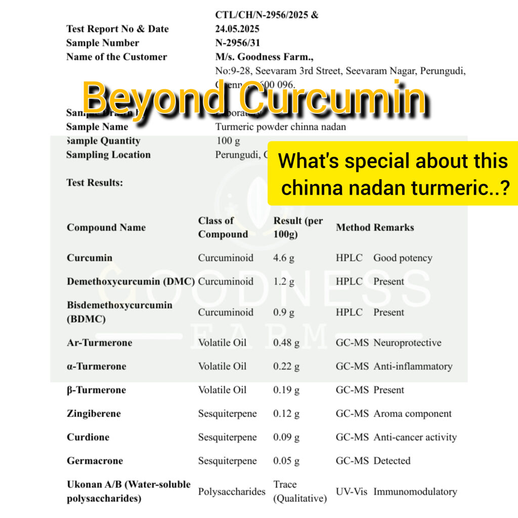 Your Chinna Nadan turmeric powder retains not only curcumin but the full spectrum of compounds — volatile oils, minor curcuminoids, and functional polysaccharides — all thanks to your regenerative cultivation and traditional processing.