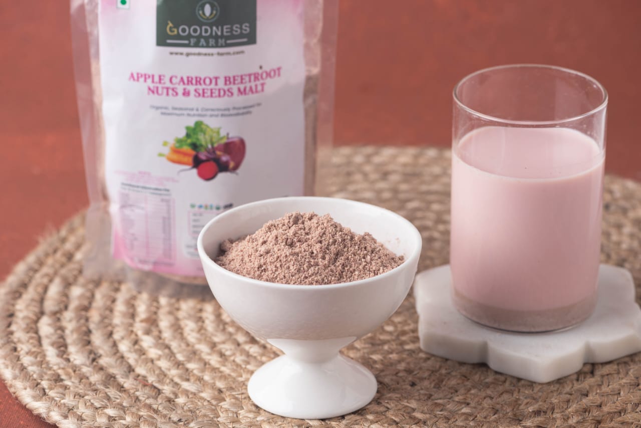 ABC powder, a blend of spray dried powders of apple, beetroot, and carrot, combined with sprout activated nuts (cashews, mamra badam, walnut, pista) and seeds (sunflower, watermelon, cucumber, pumpkin) powder, brings together a powerhouse of nutrients, very mildly sweetened with cane jaggery powder and flavored with cardamom and nutmeg. This mix leverages the health benefits of fruits and vegetables alongside the enhanced nutrient profile of sprouted nuts and seeds, making it an ideal addition to a balanced diet, especially for children.